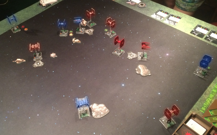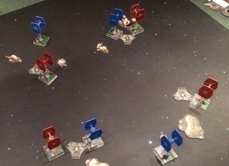 On Turn 4, with damaged TIE Fighters on both sides but no casualties, each team received a reinforcement of two Black Squadron Aces.