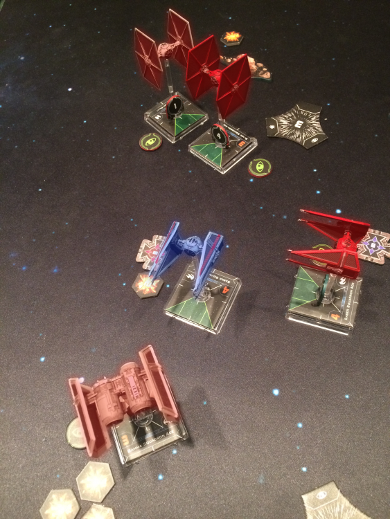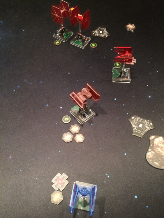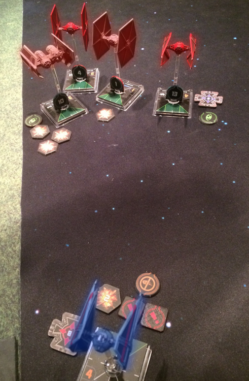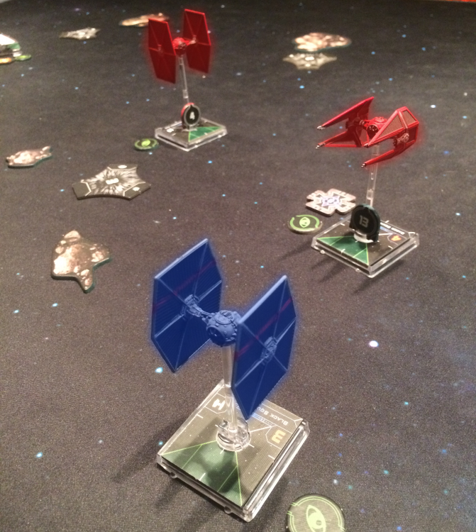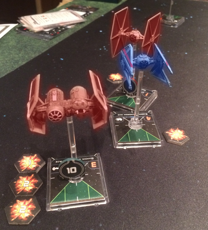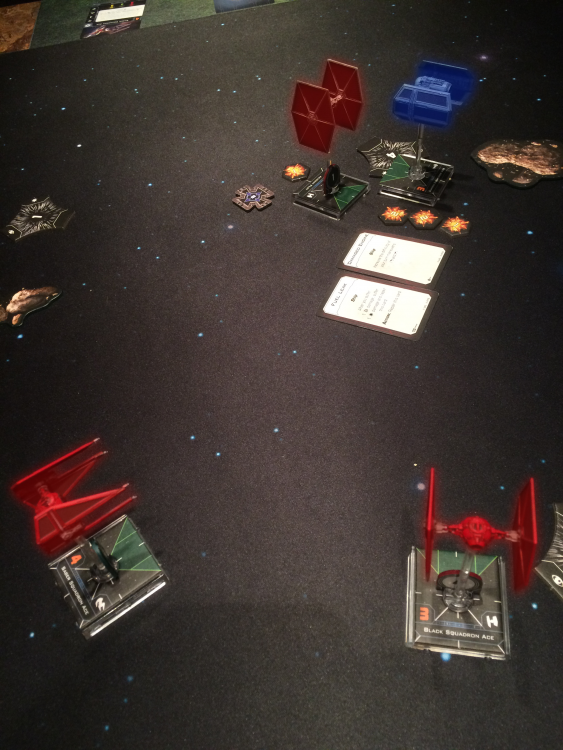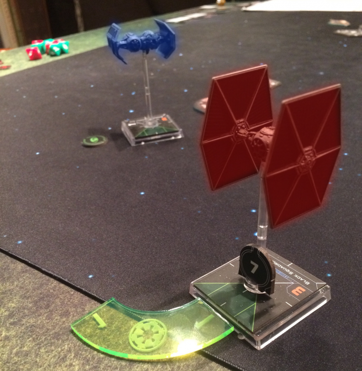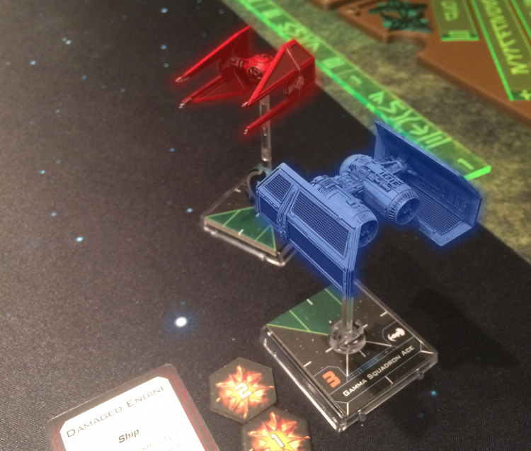 Rather than suffer the indignity of taking fire from a Blue Solo Bomber, this Red HotAC TIE Fighter flew off the table. With no way to swerve that would keep it on the table, the full-health ship was removed.