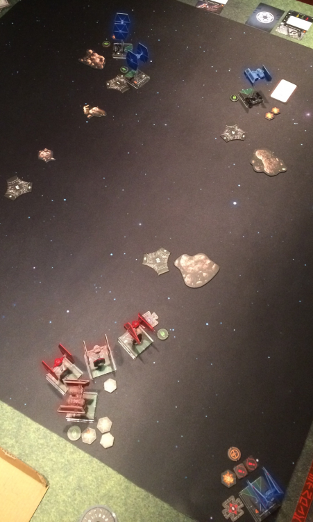The first Academy Pilot TIE Fighters from Blue Team (Solo) are deployed directly across from their antagonists on Red Team (HotAC). Asteroid placement in this mission was wonky in that we wanted to keep it roughly symmetrical, which was impossible with four hyperspace tokens while obeying all the other rules about proper spacing and placement. No need to write in about it!