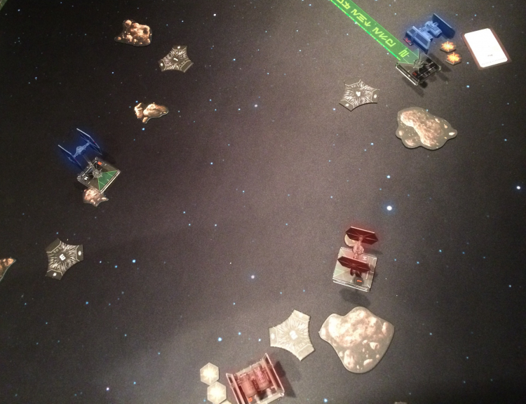 With the Blue Solo Interceptor handled, team Red HotAC swiftly turned to find new prey. A hapless Blue Solo TIE Fighter beached on an asteroid looked like an easy target and drew their attention. Note the Blue Solo Bomber, which spent four turns pointlessly flipping k-turns in the middle of nowhere for absolutely no reason. My partner and I agreed this was the space version of doing donuts in a parking lot.