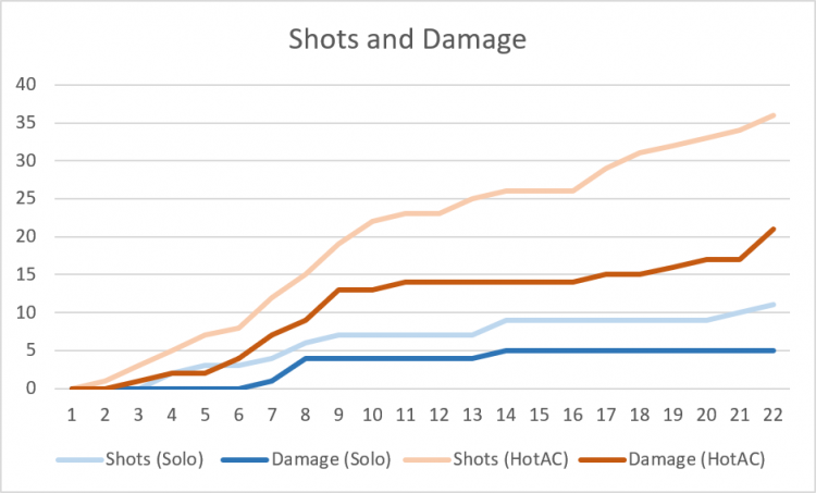 Total number of shots and damage inflicted over the course of the game, tracked on each of the 22 turns.