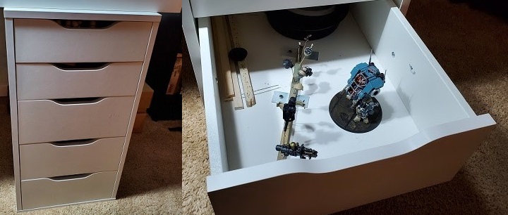 Having an established area for both your tools and for unfinished models/sprues is essential for me. In addition to knowing where your shit is at, having a drawer for work in progress also helps minimize dust and acts of catte. Storage to me is the most underrated part of a good workspace.