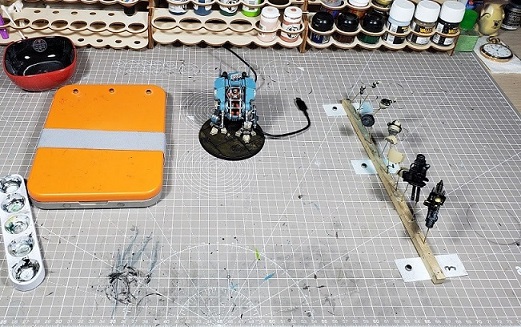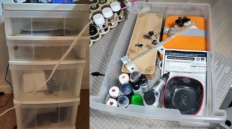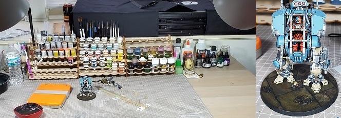 TheChirurgeon: Living in an urban area, I'm not so blessed with space. But what I try to do is keep a setup where the paints and items I use most often are readily accessible. You can cut down on the desk sprawl by keeping the paints you need for a particular project handy and storing the rest, and making sure that things continually go back in the same space over and over. This reduces the amount of time it will take you to find things and speeds up your hobby progress.