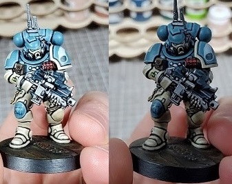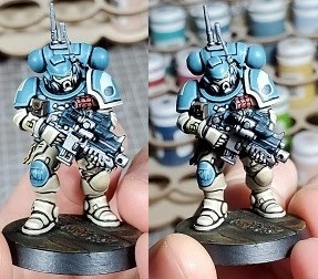 Finally, you want redundancy. Models create natural shadow on their own even without other factors, and having one spotlight source is going basically blind you to anything that isn’t in direct light. Then there’s your hands, the brush, the shadow from your head, etc etc etc. I consider two spaced out light sources the minimum, ideally an overhead light in addition to these two spotlights would be perfect. The last advantage to redundancy is there’s nothing stopping you from just turning off other sources if you want an idea of what your model will look like with a singular light source, you can use this as a reference and them continue painting with uniform light once you are comfortable with knowing where light and shadow should be on the figure.