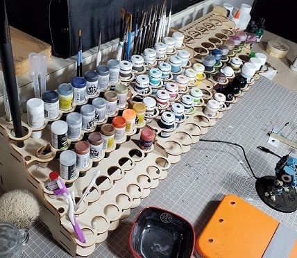 Paint and brushes should be where you look for them consistently. I love my rack (mine is by broken token but any M.D.F. rack will work) and I’ve seen other folks stack pots vertically in various contraptions. The reason I like my solution is it also allows for convenient storage for brushes and other equipment. I keep less commonly used items in a drawer, but that’s personal preference.