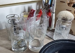 Beer tastings are an excellent source for little glass cups. These are great for storing miscellaneous tools. Yes, go to beer tastings so you can get these little glass cups.