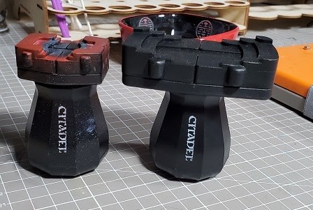 Raf: Using painting handles after years of holding the model takes some getting used to, but I will say that once you're use to it it's pretty great. I've been using old pill bottles for years and having an entire squad mounted on these makes some organizational improvements that - like many things on this list - go a long way to helping make you more efficient.