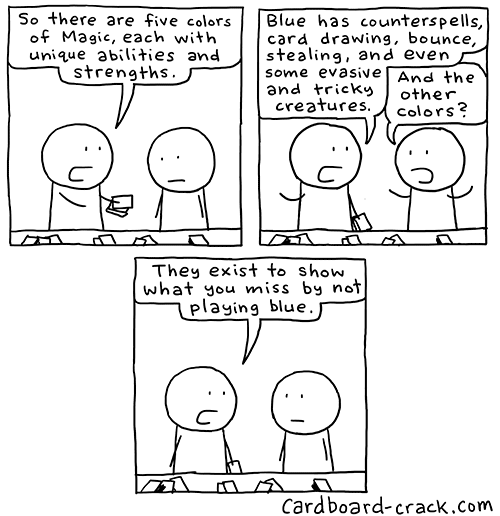 One of the things that eluded Magic in the beginning was a sense of ownership, a sense of place in the game for the protagonist, aka the player. The original backstory of Magic explained that you were a sort of generic wizard, a planeswalker, immensely powerful, wandering from plane to plane fighting over mana, or something, engaging in duels against other planeswalkers. You were also functionally immortal, because of some weird narrative need to explain why you could lose games and still live. Given the lack of narrative structure in the game, it's actually a bit surprising Magic caught on as well as it did. Who were these mysterious wizards? What did they want? (