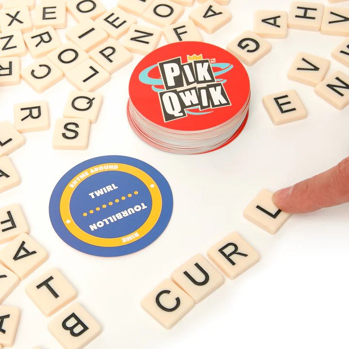 Pik Qwik is a brand new tile-based word game in the same general family as Bananagrams. Pik Qwik comes with a large pile of tiles and a stack of circular cards. The cards have a word on them and come in 4 categories: Mix-Up, Same Name, On-Topic and Rhyme Around. Each round a card is flipped and players race to spell a word that fits the category. For example, if the card category is Mix-Up and the word is Steam, you're racing to find any word that uses any number of letters in Steam. Fastest wins, but if two people tie in slapping the buzzer whoever spelled the longest word wins.